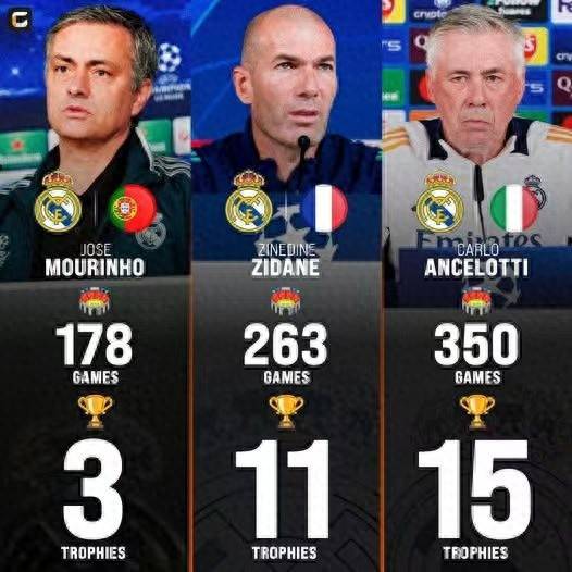 穆里尼奥(葡萄牙):共执教皇马178场,夺得3座冠军奖杯,分别是西甲、国王杯、西班牙超级杯。齐达内(法国):共执教皇马263场,夺得11座冠军奖杯,分别是欧冠(3座)、西甲(2座)、世俱杯(2座)、欧洲超级杯(2座)、西班牙超级杯(2座)。安切洛蒂(意大利):共执教皇马350场,夺得15座冠军奖杯,分别是欧冠(3座)、西甲(2座)、国王杯(2座)、世俱杯(3座)、欧洲超级杯(3座)、西班牙超级杯(2座)。或许有人问皇马这三任教练谁更伟大?个人观点,或许齐达内和安切洛蒂的冠军更多,但把皇马带出困境是穆里尼奥,遇到的巴萨也是最强的,穆里尼奥执教皇马与齐达内以及安切洛蒂一样伟大,你认同这个观点吗?